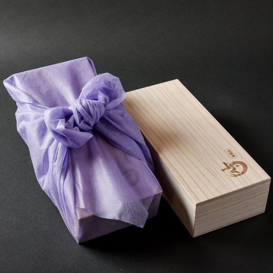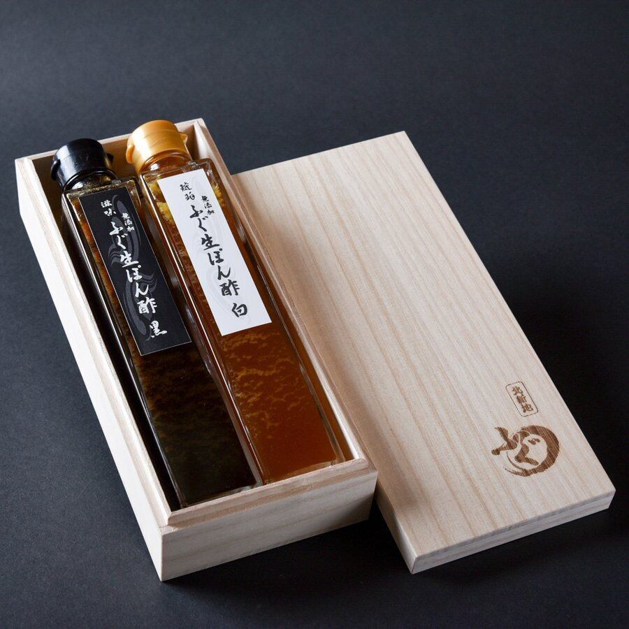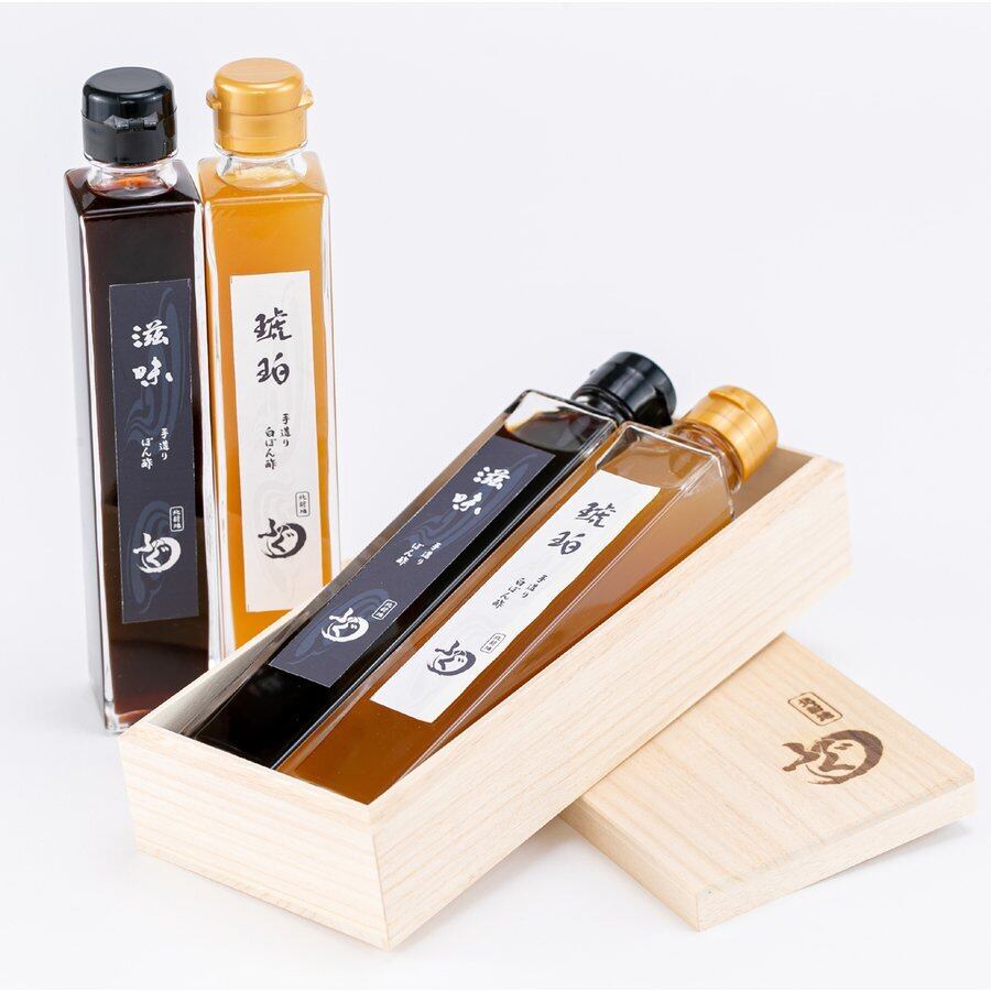 白ポン酢『琥珀』と黒ポン酢『滋味』を高級感あふれる桐箱に詰めました